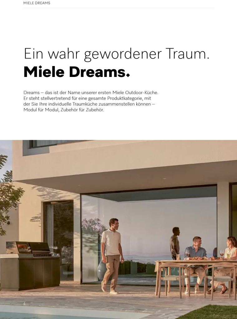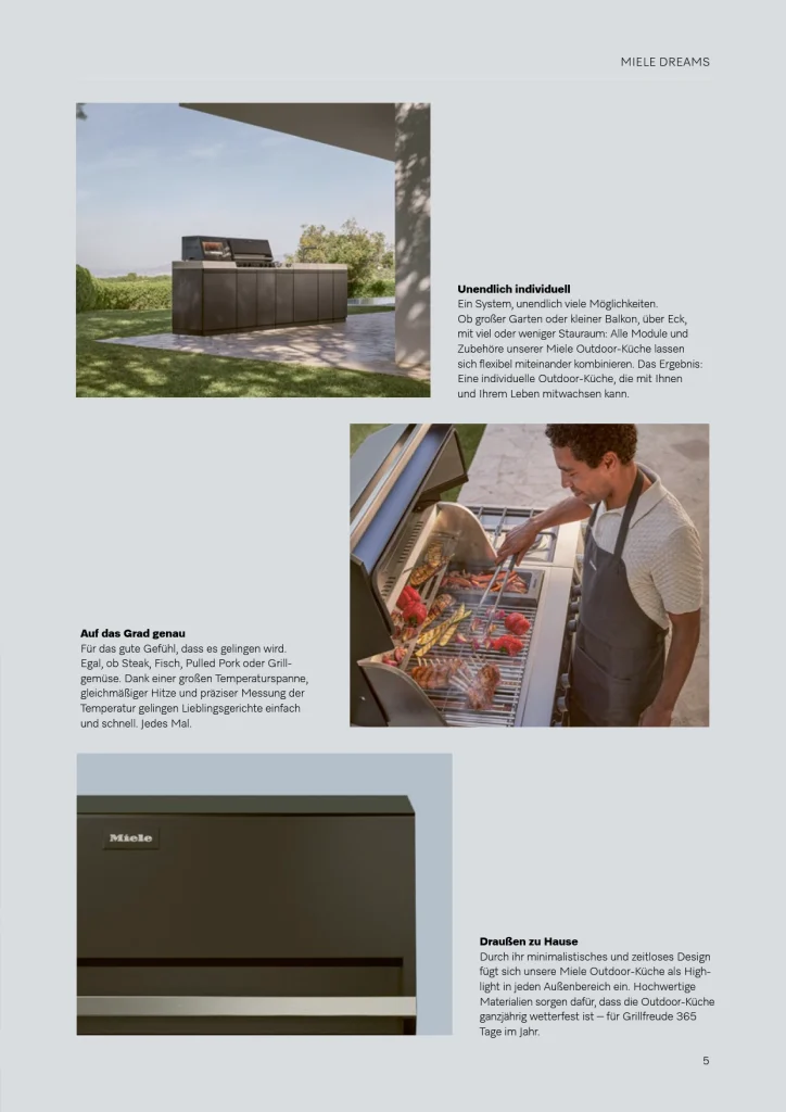 Die Miele Dreams Outdoor-Küche ist eine modulare Premium-Außenküche für Terrasse, Garten oder Outdoor-Wohnbereiche. Sie kombiniert leistungsstarke Grilltechnik, hochwertige Materialien und durchdachte Stauraumlösungen zu einer kompletten Koch- und Grillstation im Freien.