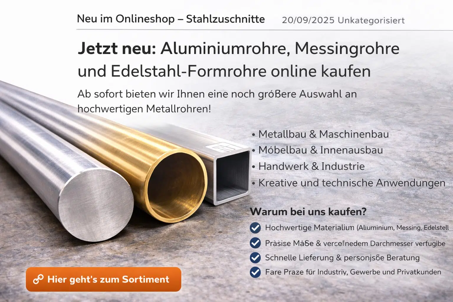 Jetzt neu: Aluminiumrohre, Messingrohre und Edelstahl-Formrohre online kaufen