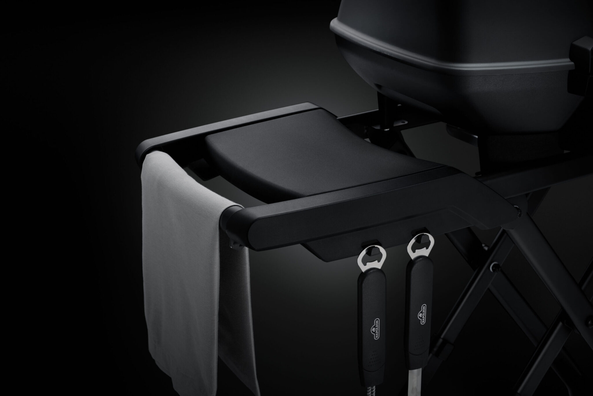 Mit seinen praktischen Seitenablagen, samt Besteck- und Handtuchhaltern, bietet der solide Wagen Platz für Zubereitung und Zubehör. Durch die großen Räder wird der TravelQ™ außerdem zum praktischen Grilltransporter und lässt sich eingeklappt mittels Wandaufhängung besonders platzsparend aufbewahren.
